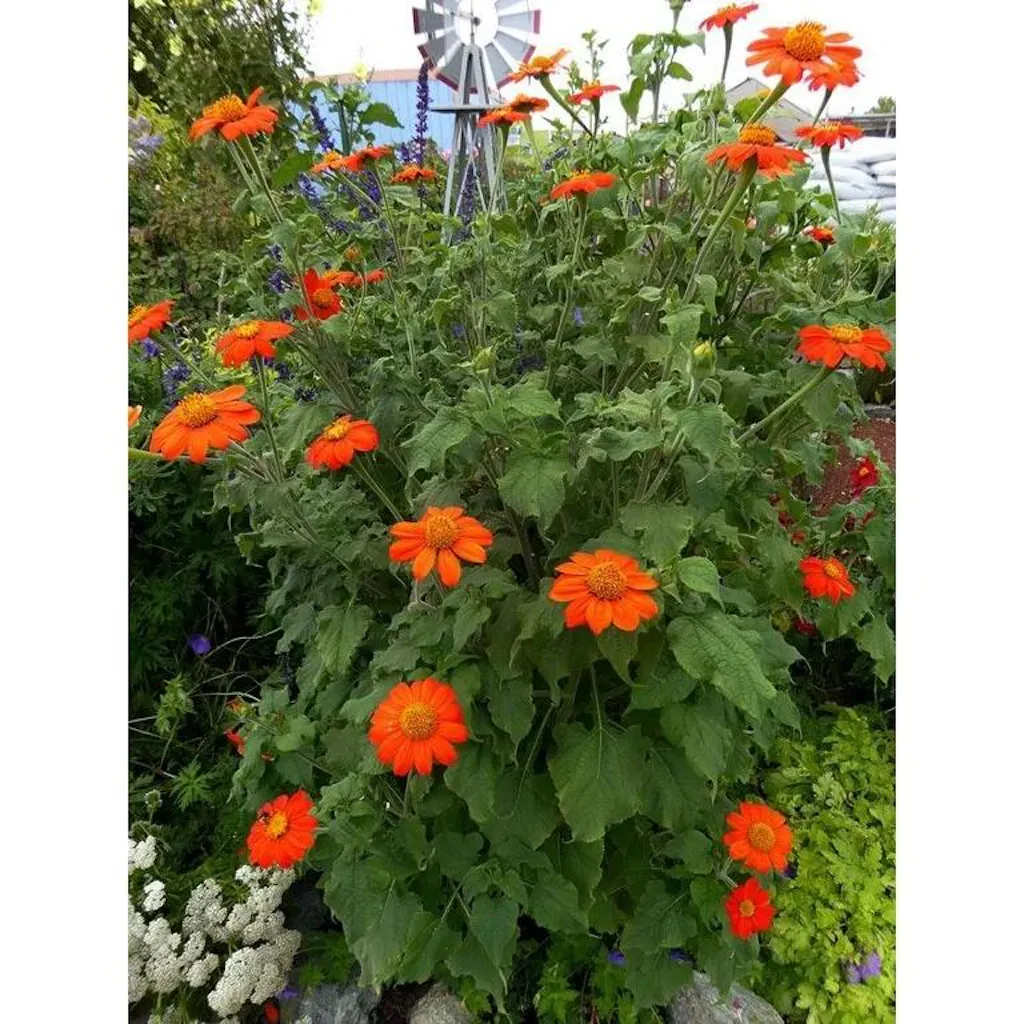 Mexican Sunflower, thrives with minimal care, prefers warm conditions, and is drought-tolerant once established. Water moderately, especially during dry spells, but avoid overwatering. Tithonia grows tall and may need staking in windy areas to prevent bending or breaking. Deadheading spent blooms encourages continuous flowering and prevents excessive self-seeding. While it tolerates poor soil, occasional feeding with a balanced fertilizer can promote vigorous growth.
